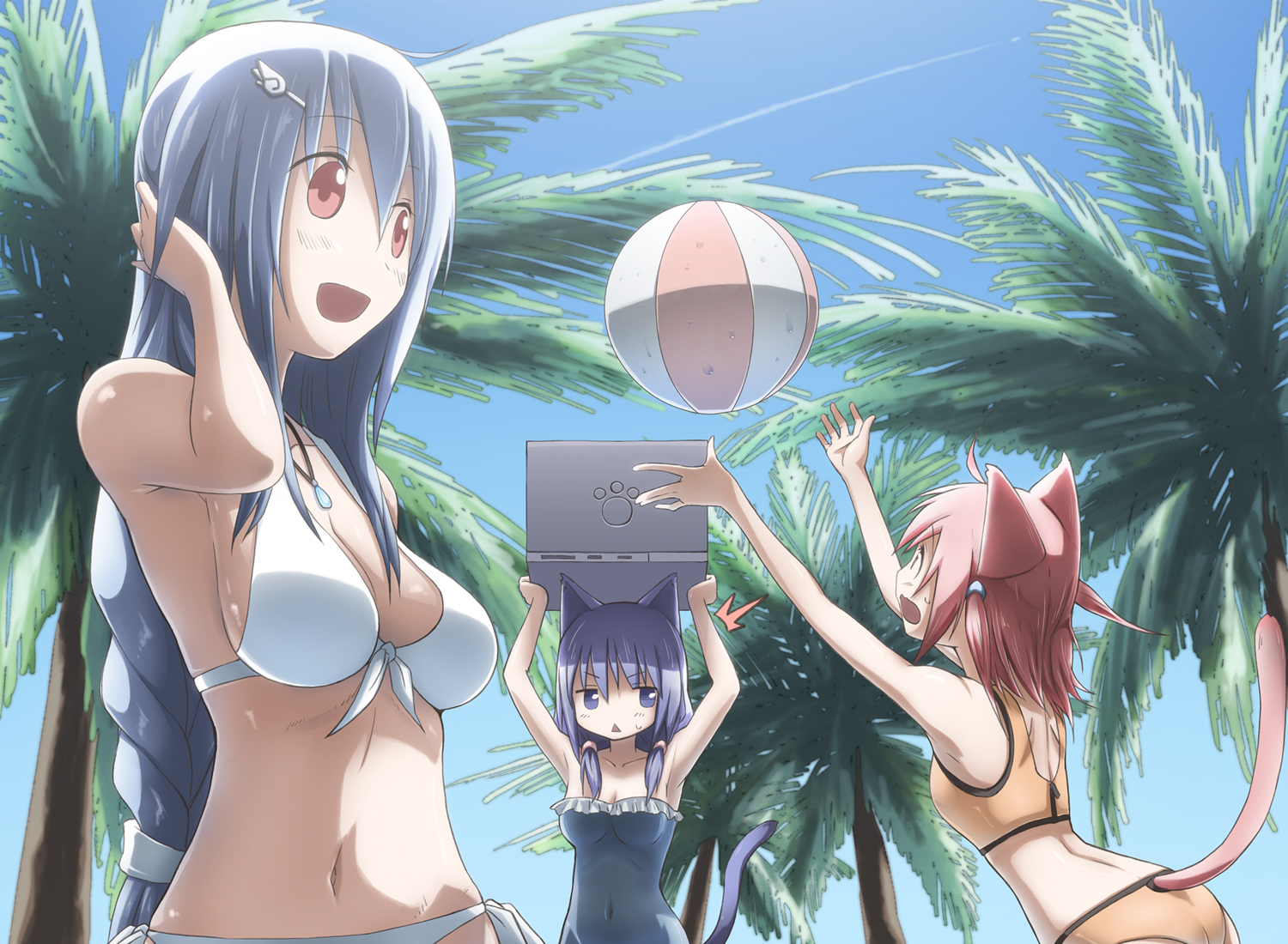 Suddenly you see the laptop shine, you are on the beach, you see girls somewhat far away, but closer you see one with the hair tied as a braid, another pink hair with cat ears, next to them you see the magic laptop, you go fast for she, the other 2 girls alike, for some reason both of them and you say the same thing, "hey girls, what want with this laptop", you tell them that it's from your friend, the others says the same thing, you call Mike and your roommate, they answer you, activate the laptop camera and see 3 girls there, no boy.